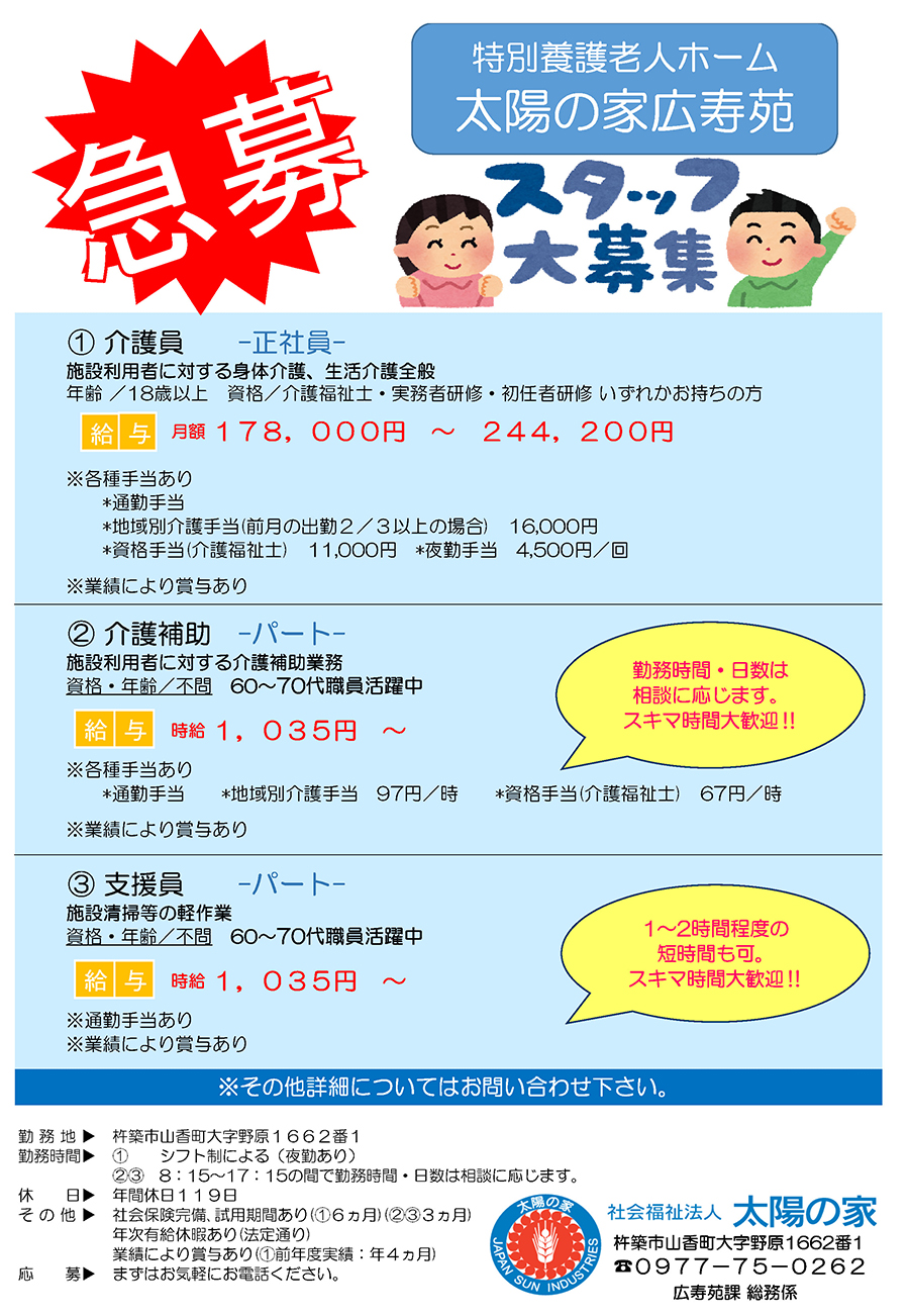 太陽の家広寿苑では、一緒に働く職員を募集しています。 見学や仕事内容の説明はいつでも承ります。 電話(0977-75-0262)もしくは